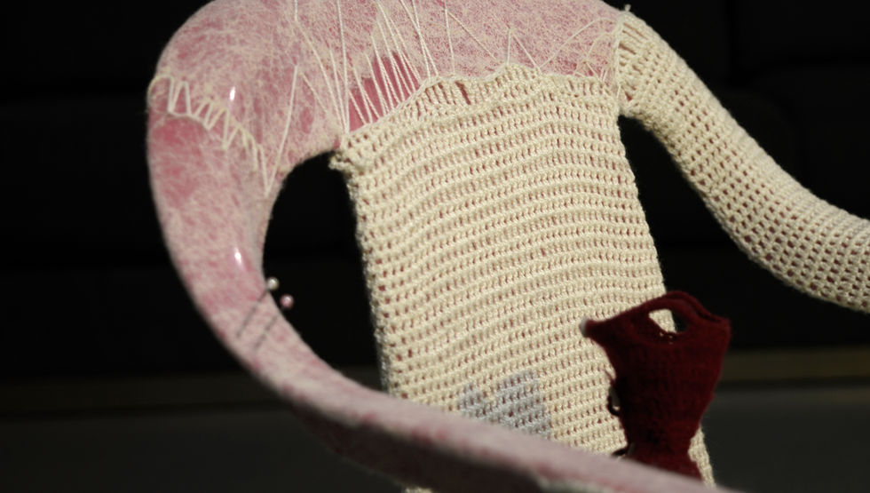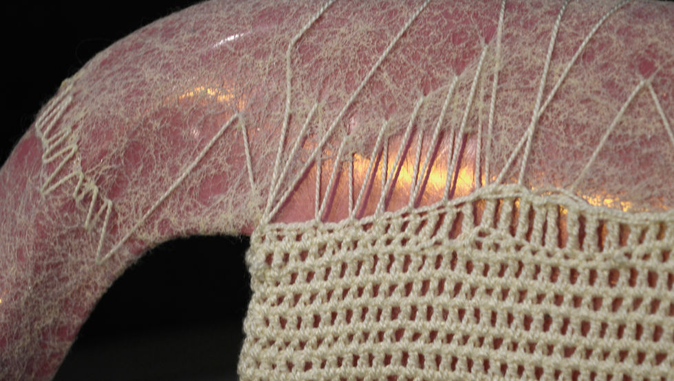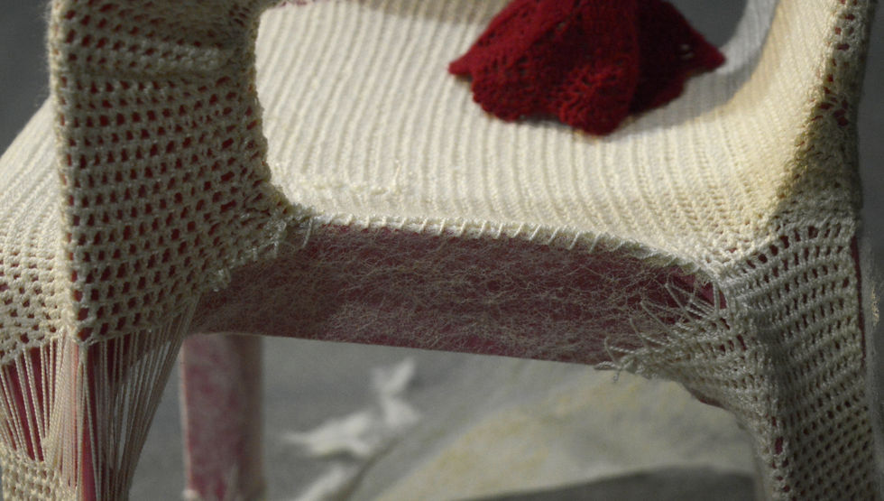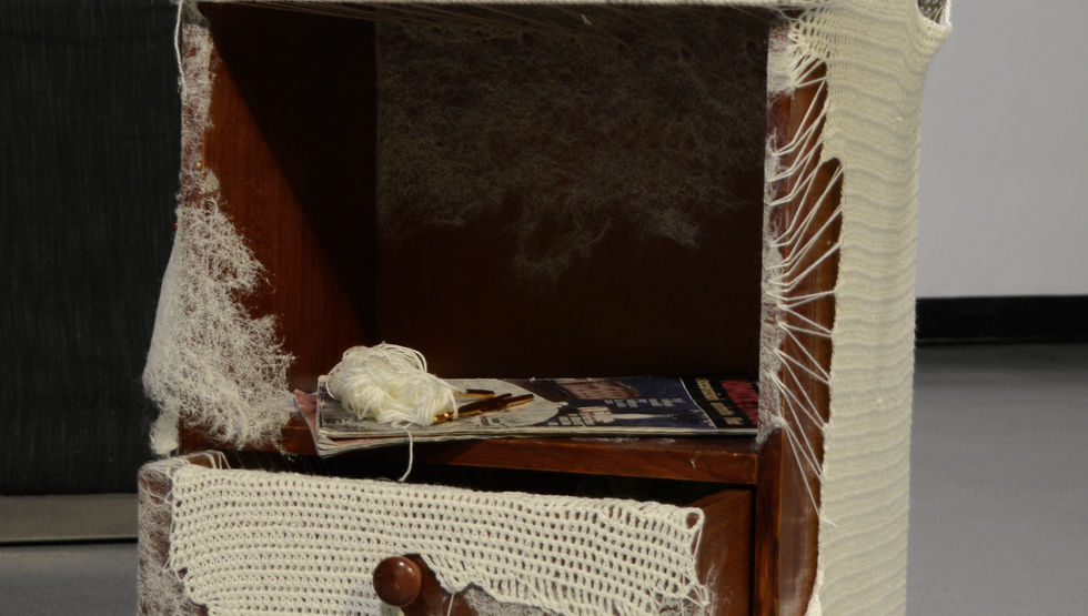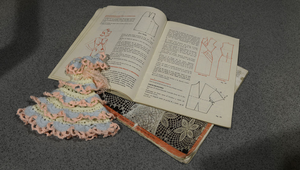 Un hilo, una sola línea que cubre, protege; que viste las imágenes y los objetos que pertenecen al recuerdo, que pertenecen a las imágenes de mi infancia y la enseñanza de mi mamá, una línea que se teje, se dobla, para convertirse en pliegue, en tela y unión. Cuando era niña veía a mi madre tejer aquellos vestidos que servirían a mis muñecas, añoraba el día en que mis ojos estuviesen bien para que ella pudiese enseñarme tan bella y pasiva labor. Sus manos me enseñaron el movimiento correcto para convertir esa línea interminable de hilo en nudos, puntos y puntadas para dar forma a las cosas que en mi imaginación se pudiesen dar.